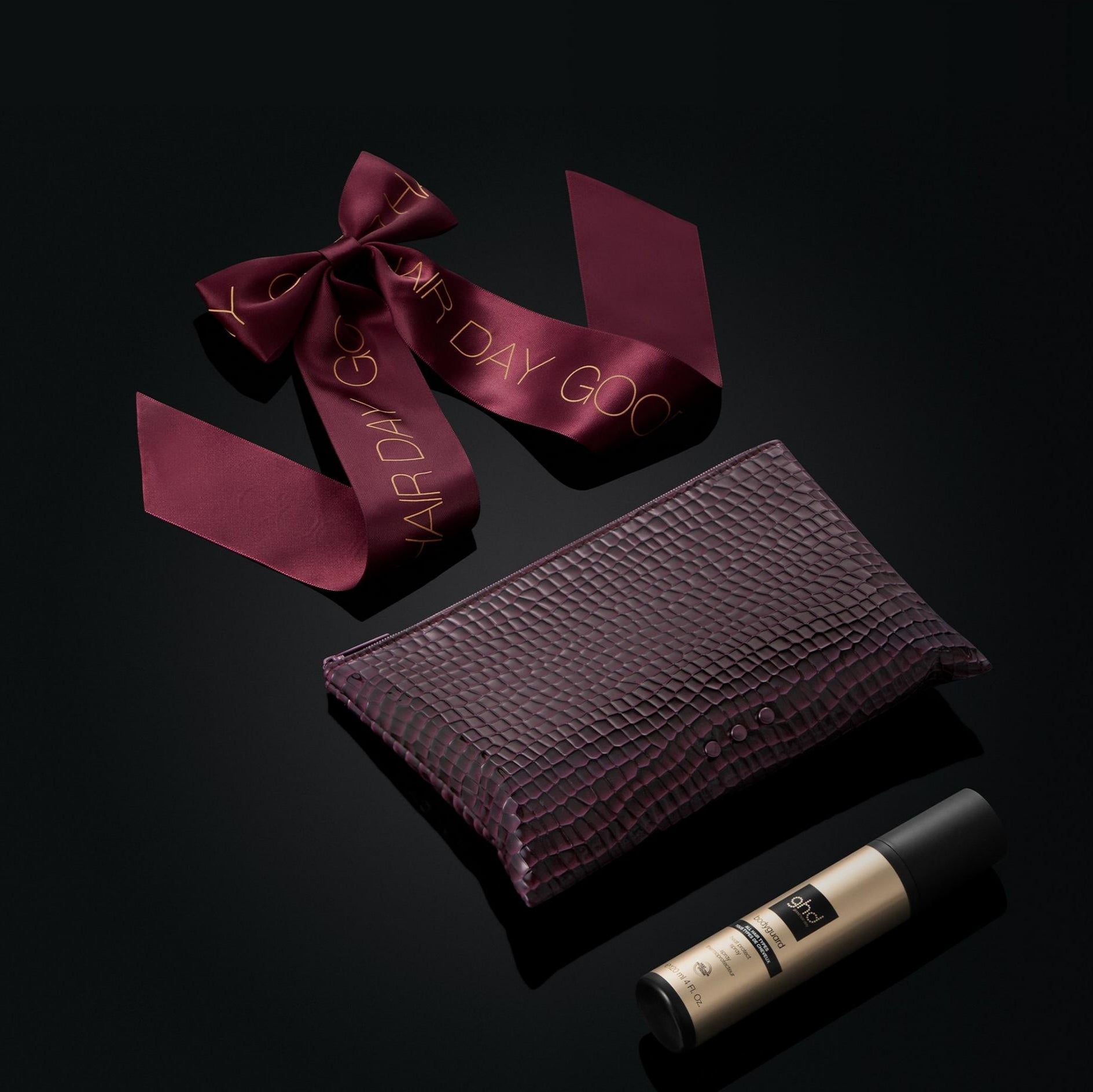 Experience luxurious styling with the ghd Style Gift Set from our Cherry Chic collection, inspired by the sophistication of a five-star getaway. Housed in a cherry-colored wash bag, this set features the ghd Bodyguard heat protect spray, designed for all hair types to guard against heat damage while leaving hair smooth and glossy. The lightweight formula forms an invisible barrier, keeping your hair protected with every style. It also includes a limited-edition ghd hair clip with a satin bow, adding an elegant touch to your look. Simply spray on towel-dried or dry hair before using heat styling tools for flawless results.