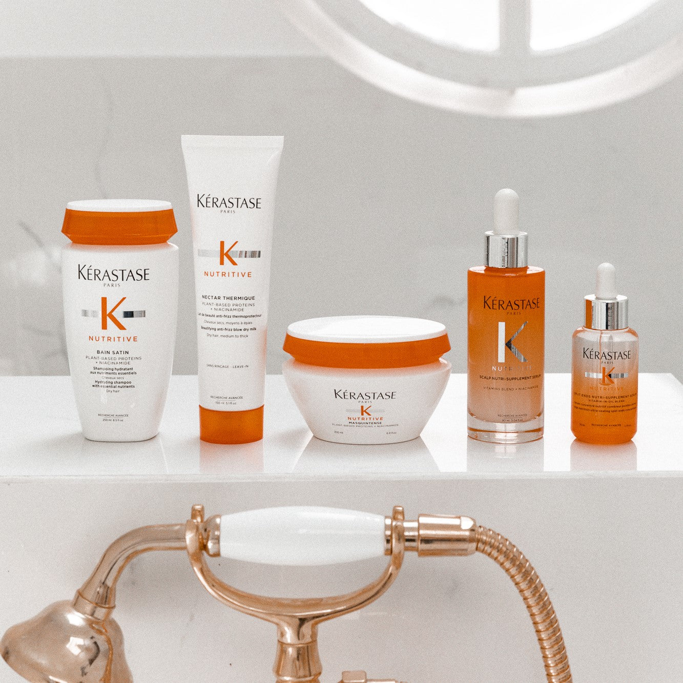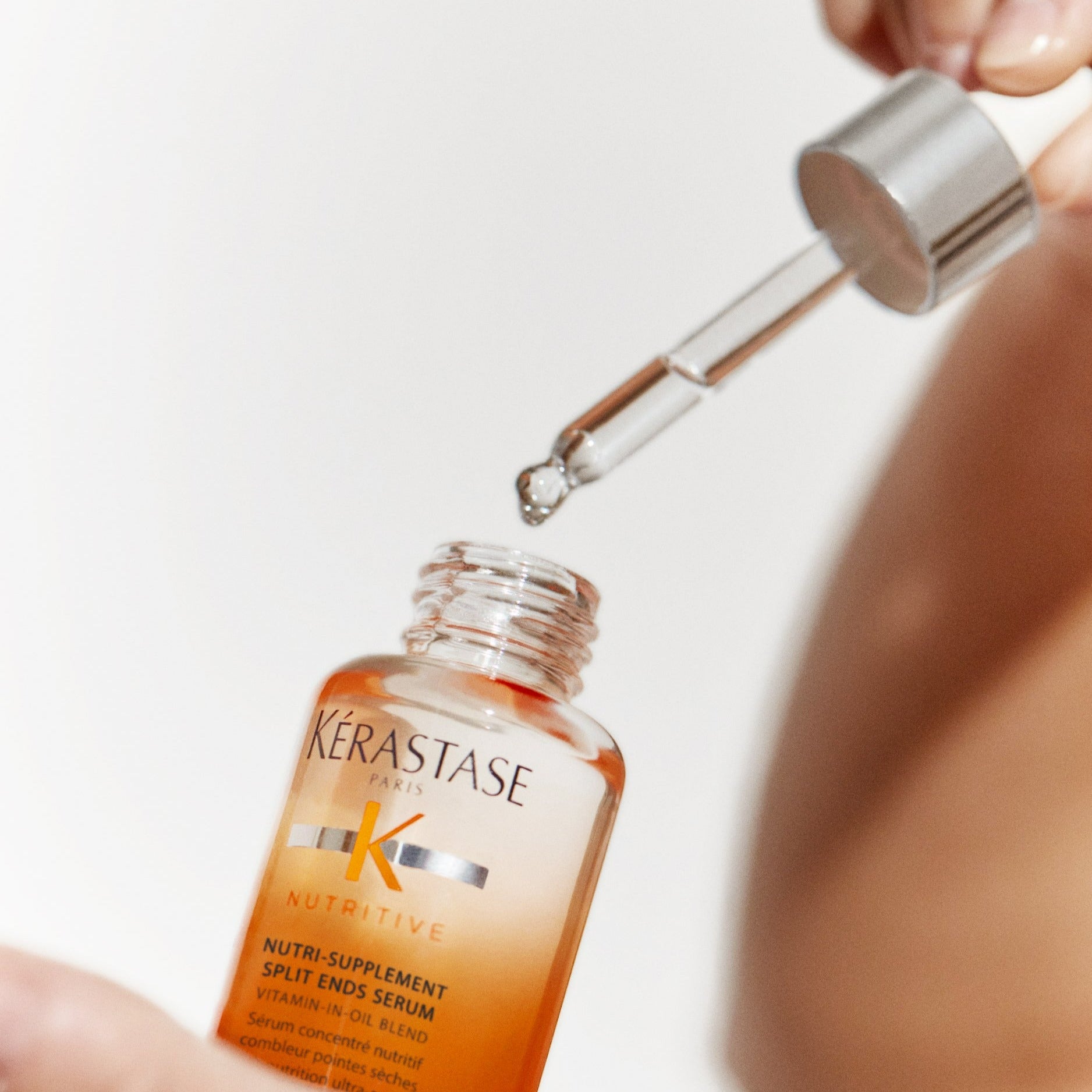 Kérastase's Nutri-Supplement Split Ends Serum seals dry ends, blocking split ends and transforming hair from dry and brittle to nourished and reinforced. Bursting with powerful nutrients, this ultra-sealing split ends treatment is fortified with anti-dryness polymers and a translucent oily texture to keep hair hydrated. Feel the difference as your hair's vitality is restored!